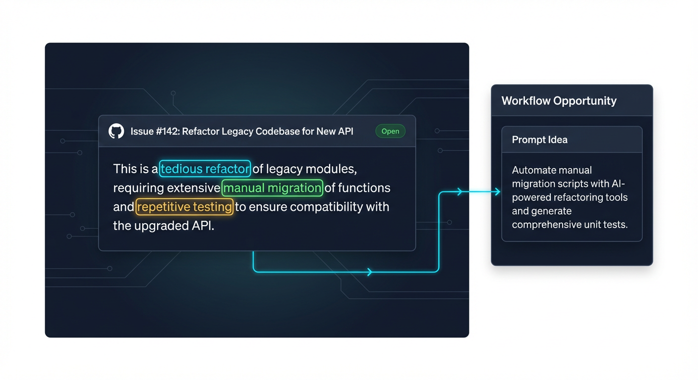 - Mine GitHub repos, issues, and discussion boards to find recurring "AI friction" patterns (refactors, tests, migrations, bug triage, code review).