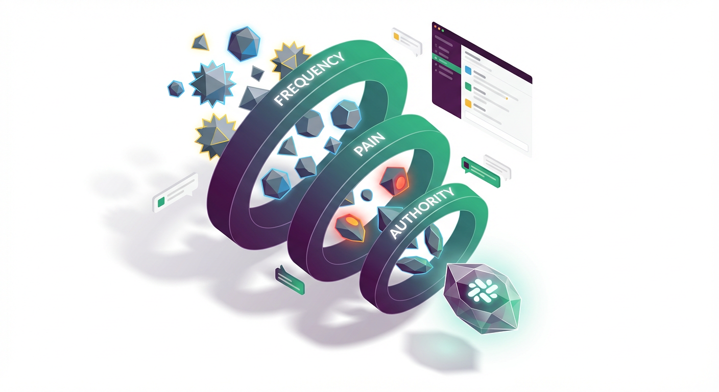 - Generate and filter Slack bot ideas using "frequency x pain x authority" criteria